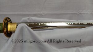 これ、真剣ではなくて、美術品。なんだけれど、確か7万5千円以上で、柄の鮫皮は親粒入り(高物)、正絹(しょうけん・本絹の折紐)で、拵え(こしらえ・外装)は本物用に近いもの。刀身は真鍮材(頑丈な方の真鍮・真鍮材はいろいろ強度に種類があります。)で、重さが測ってみたら、鞘無しで何と1.12kgもありまして、これ真剣の重いもの、例えば同田貫(拝一刀の愛刀)と同じくらい。長さ2尺4寸5分くらいの常寸。薄刃仕上げで紙なら切れる。
