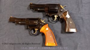 この2丁、本当そっくりでしょ。357マグナムの方が一回り小さい感じなんですけど、あんまり実は持った感じ変わりません。でも44マグナムの方は、やっぱり銃身(筒の部分)が太くてごついです。