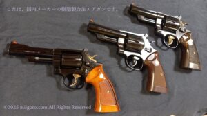 写真の遠近で、一番手前のコンバットマグナムが一番大きく見えてしまいますが、まあ、あんまり大きさは変わらないということです。ちなみに、コンバットマグナムのグリップは実銃のもの。グリップだけですよ。念のため。