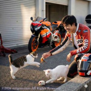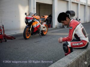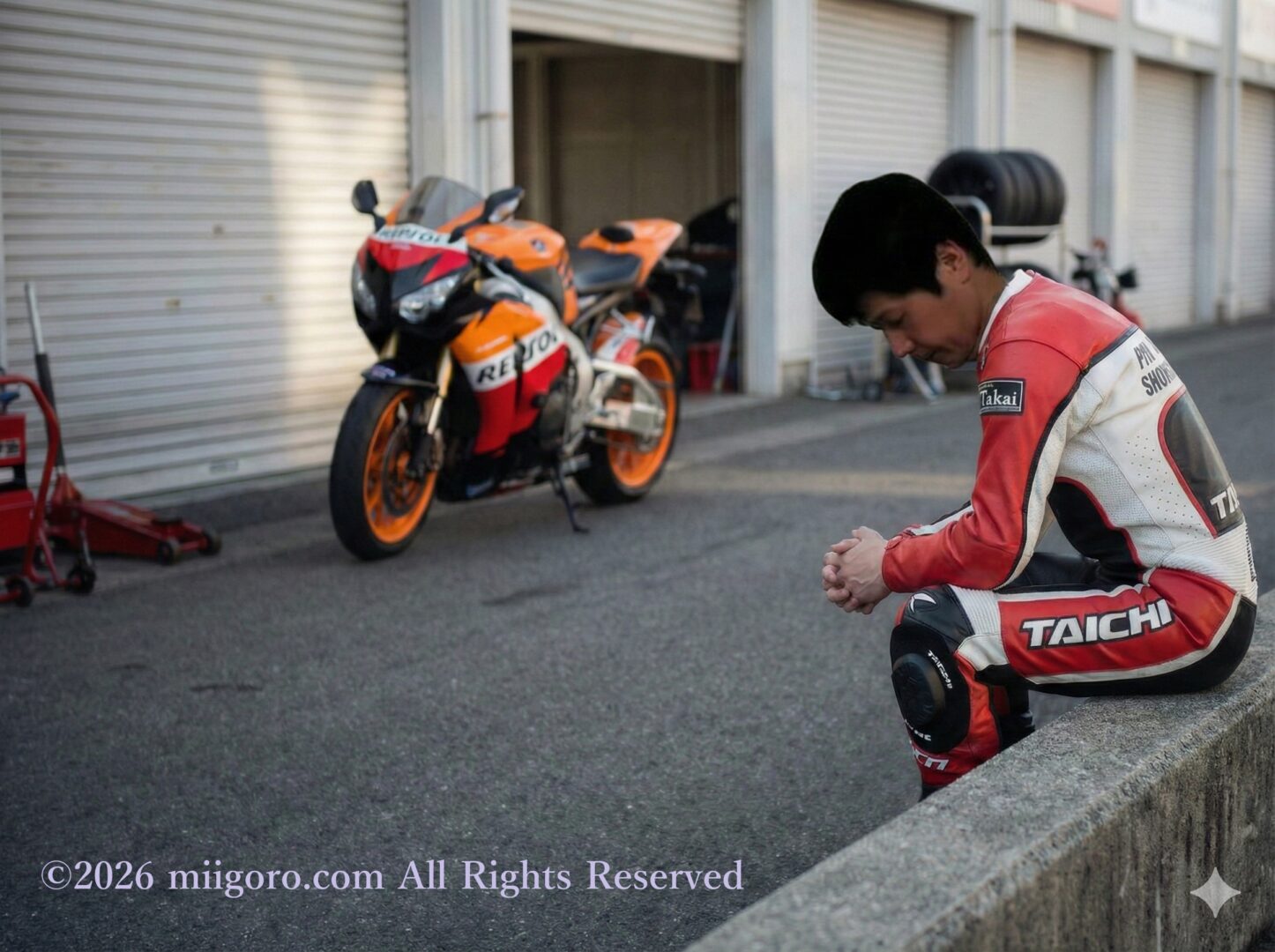 花子のエピソードの作成がまだなんですけど、この横顔から、まあまあ兄貴の面影をよく再現したもんです。この辺はAIの本領ですかね。サーキットの雰囲気、それも日本のどこかのサーキットのピットをよく知っている。